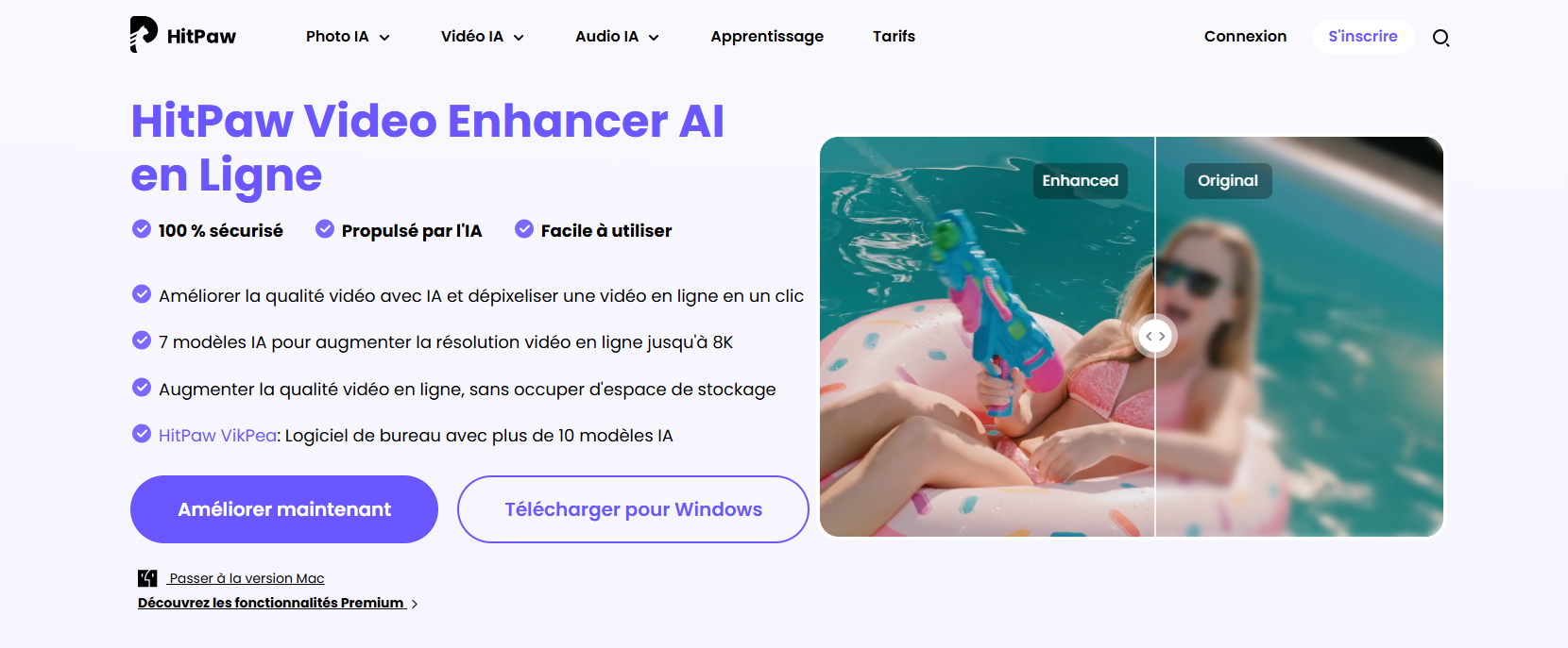 HitPaw VikPea n'est pas seulement pour les ordinateurs de bureau. Sa version en ligne est bien plus puissante que Clideo. Elle supporte les résolutions 4K/8K, utilise l'accélération GPU cloud pour un traitement plus rapide et gère facilement les fichiers volumineux et les téléchargements par lot. Elle offre également une réparation détaillée et une restauration des couleurs qui donnent un aspect professionnel et poli aux vidéos.