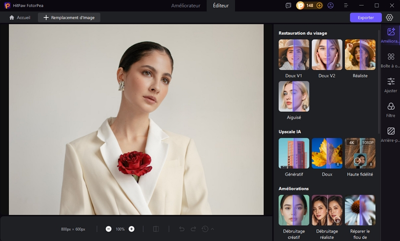 Attendez que l'IA termine le traitement. Vérifiez ensuite l'image traitée pour vous assurer que la clarté et la résolution vous conviennent. Pour finir, cliquez sur "Exporter" pour télécharger l'image sur votre ordinateur.